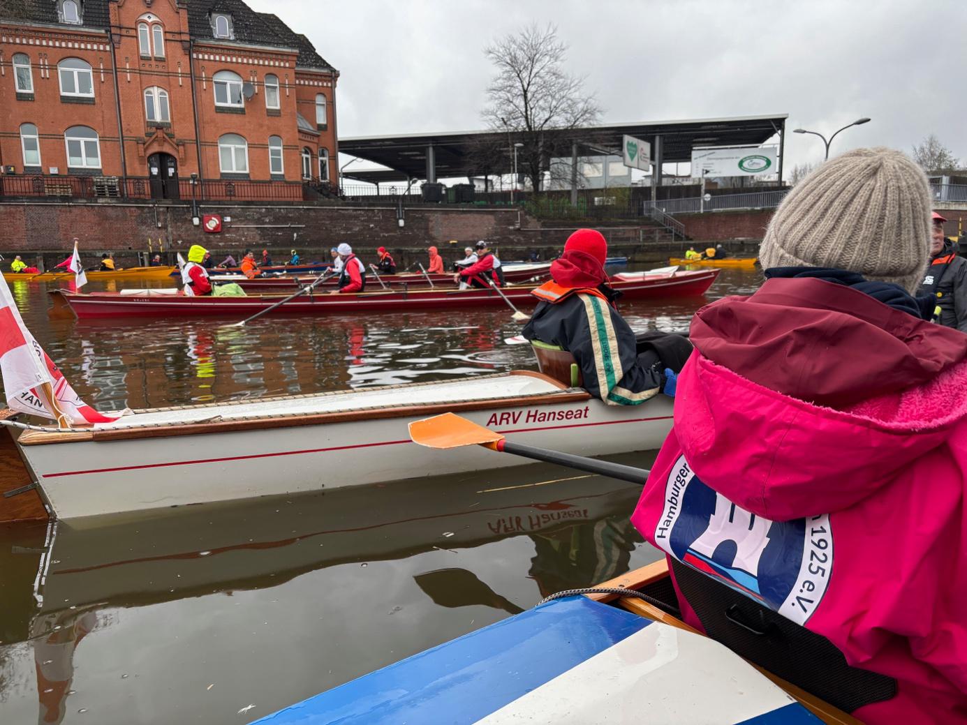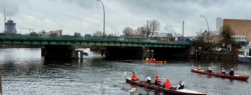 Das ist seit ein paar Jahren das erste Anrudern an der grünen Brücke gewesen und für eine große Zahl der Beteiligten bei uns das erste Mal. Aber das macht Laune und wir werden das sicher wiederholen. Also bis bald auf der Bille!