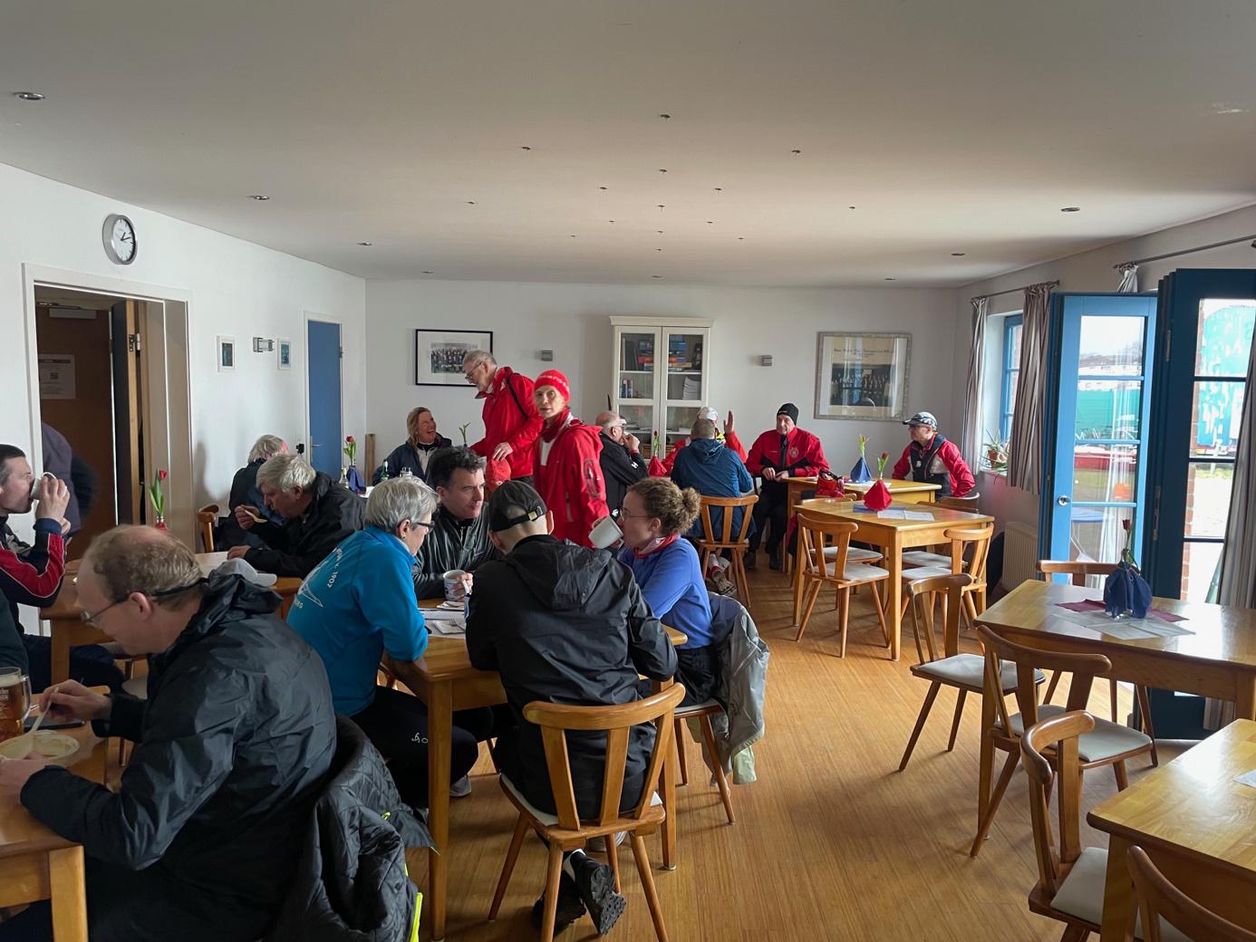 Die RV Bille wäre nicht die RV Bille, wenn sie auf entscheidende Fragen keine Antwort hätte: Wieviel Bier ist in der Kühlung, wo kommt die Suppe her, haben wir eigentlich tiefe Teller, wie ist das Wort vegetarisch zu verstehen, reichen unsere Sicherungen für Crêpes plus Kaffeemaschine und wer von uns kann eigentlich Kuchen backen? Mit nur zwei Mails an alle waren die wesentlichen Fragen geklärt. Wir haben in Nullkommanix die Halle zu einem gemütlichen Restaurant „Chez Bille“ umgebaut, Blümchen auf die Tische gestellt und das obligatorische Kuchenbuffet aufgefahren. Jetzt mussten nur die Boote am Steg erscheinen. Leider spielte das Wetter nicht ganz so mit wie erhofft und auch die Boote ließen auf sich warten, weil die Schleusenwärter in der Brandshofer Schleuse erst mal sein Becken mit Booten voll machen wollte, was für viele Ruderer eine knappe Stunde Wartezeit bedeutete und die gute Laune bei so einigen kurzfristig eintrübte. Aber plötzlich kam dann doch ein imposanter und bunter Haufen unterkühlter Ruder:innen unter der grünen Brücke zum Vorschein.