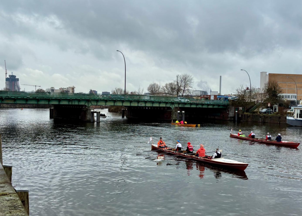 Das ist seit ein paar Jahren das erste Anrudern an der grünen Brücke gewesen und für eine große Zahl der Beteiligten bei uns das erste Mal. Aber das macht Laune und wir werden das sicher wiederholen. Also bis bald auf der Bille!
